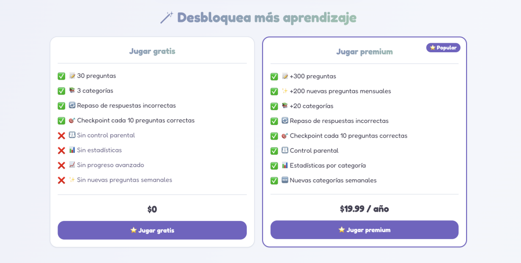 Los pequeños responden escenarios que fomentan empatía y decisiones éticas. Es gratuito en partes básicas y accesible online. También puedes contratar el plan Premium que ofrece más preguntas, más categorías, control parental, etc.