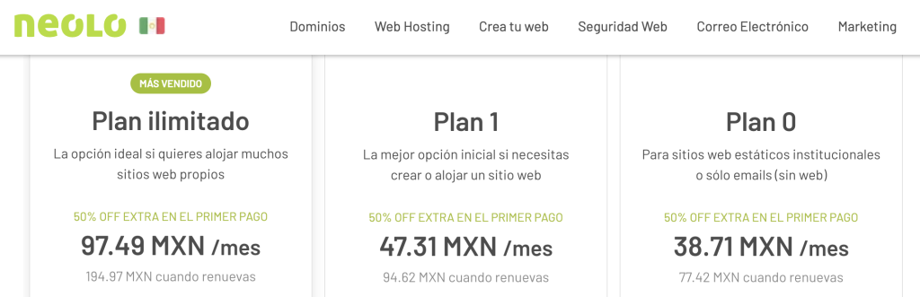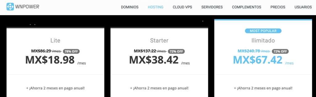 En el caso de este web hosting o alojamiento web para el mercado mexicano, los precios que se ofrecen son: En el Plan Lite MX 18.98, en el intermedio Starter MX 38.42 y el más pro llamado ilimitado MX 67.42.