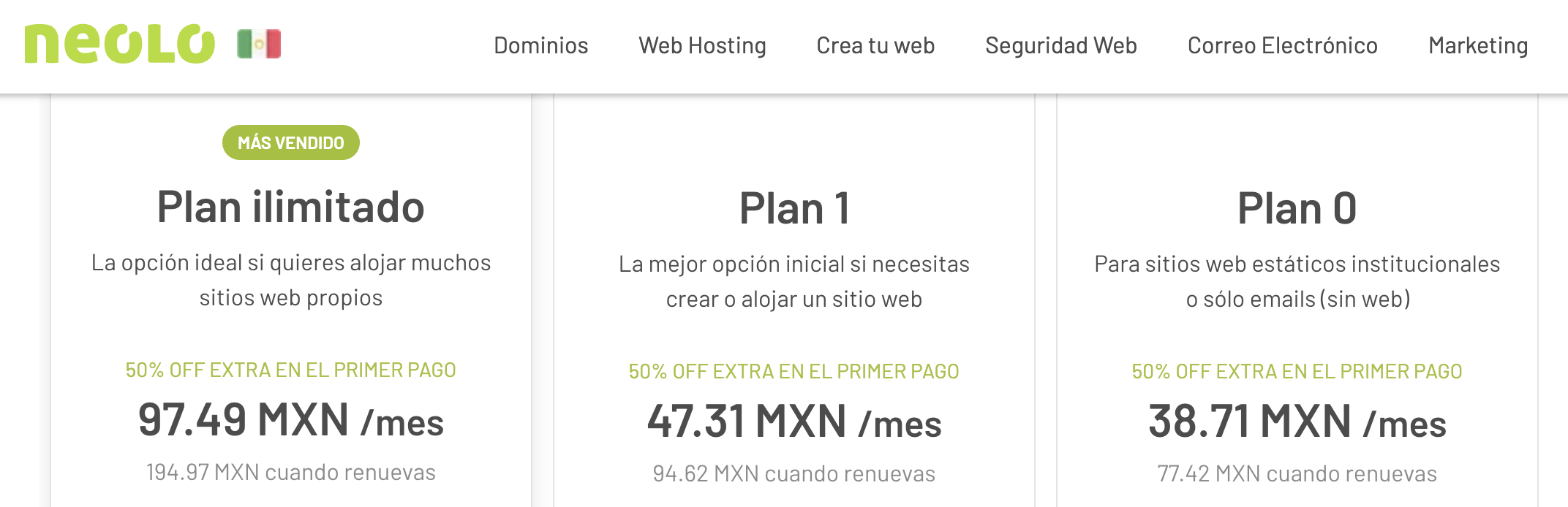 En el caso del Plan 1, el precio mensual es de MXN $47.31. Y el Plan 0 tiene un precio de MXN $38.71 por mes.