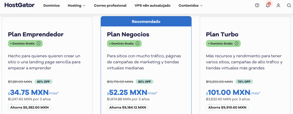 3. Hostgator200299.95%Excelente 31%MXN $52.25 Mensual