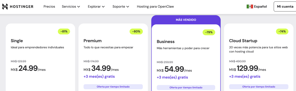4. Hostinger200499.99%Excelente 83%MXN $54.99 Mensual